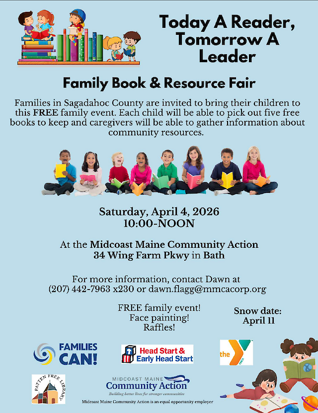 Families in Sagadahoc County are invited to bring their children to this FREE family event on Saturday, April 4th from 10:00 AM to 12:00 PM! Each child will get to pick out 5 books to take home and caregivers will be able to gather information about community resources. For more information, please contact Dawn at 207-442-7963 x230 or dawn.flagg@mmcacorp.org.