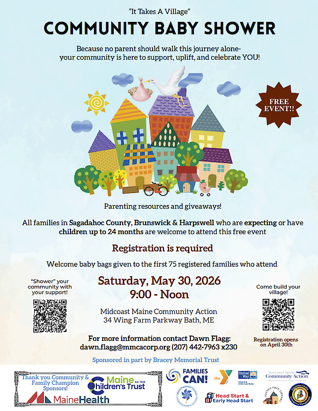 All families in Sagadahoc County, Brunswick, and Harpswell who are expecting or have children up to 24 months old are invited to this FREE event on Saturday, May 30th from 9:00 AM to 12:00 PM. Registration is required (opens April 30th). "Welcome Baby" bags will be given to the first 75 families who attend. For more information, please contact Dawn at 207-442-7963 x230 or dawn.flagg@mmcacorp.org.